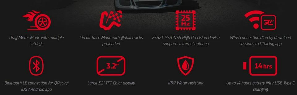 Qstarz 25Hz GPS Lap Timer with 3.2" color display and Wi-Fi/Bluetooth for data download/real-time lap timing.